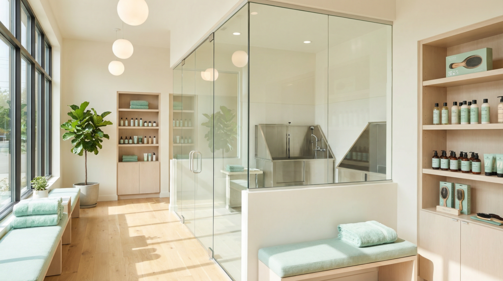 Área de banho envidraçada. Acompanhe cada etapa do cuidado do seu pet.